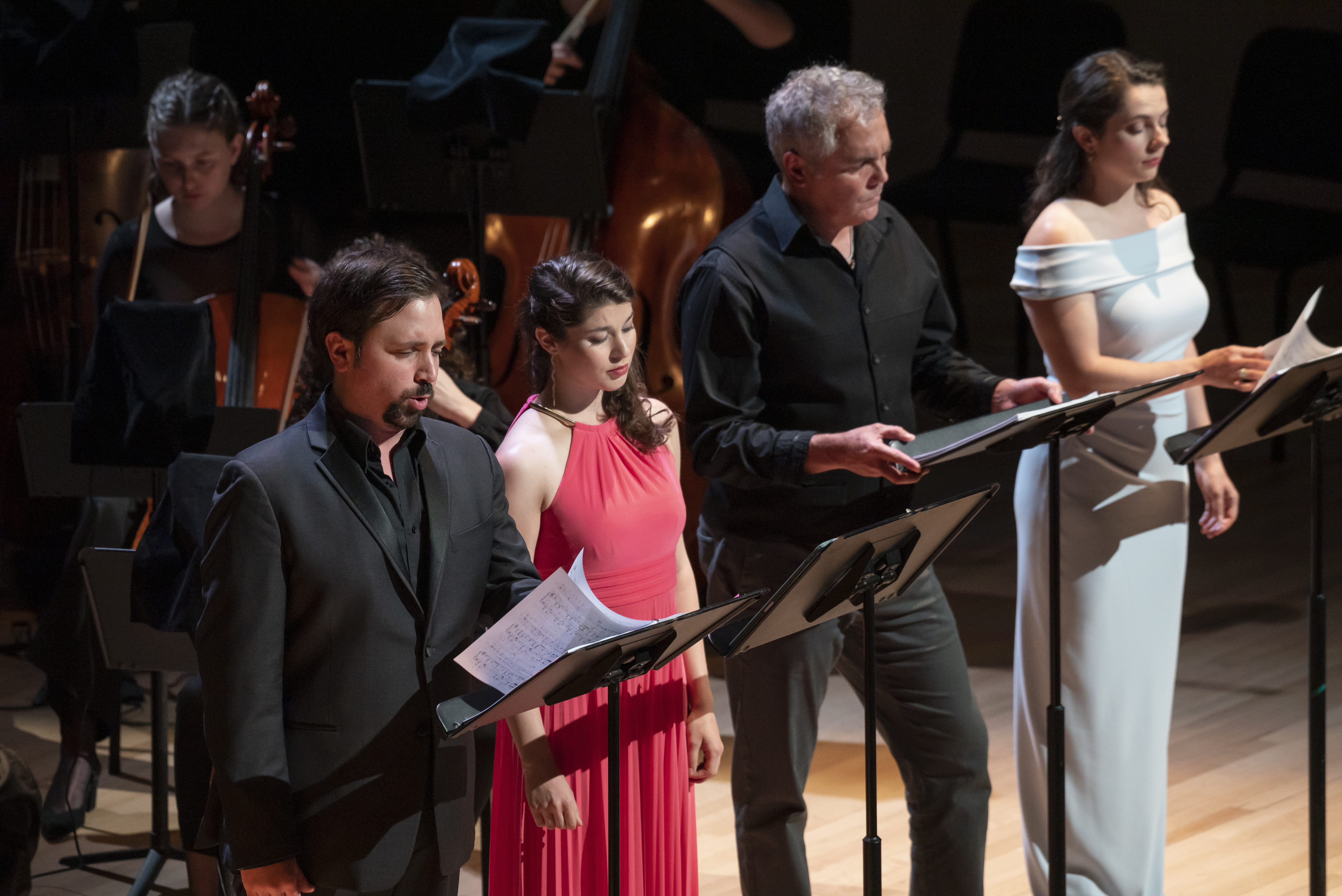 Comme mentionné plus haut, la distribution des chanteur·euses était prometteuse, et celles et ceux-ci n’ont en général pas manqué à cette promesse. Elles et ils ont néanmoins été largement sous-exploité·es sur le plan de la mise en scène. En effet, il n’y a pas beaucoup de place pour l’expression, la relation et le mouvement quand on est immobilisé·es derrière son lutrin. Certain·es interprètes sont parvenu·es à s’affranchir de cette contrainte par le naturel de leur présence scénique – je pense notamment à Bourget, Lapointe et Naubert. Mais on a aussi assisté à des moments de léger malaise, alors que le livret et la musique sous-tendaient mouvement et passion, sans que cela se traduise sur scène. Quand la duchesse Josiane s’éprend de Gwynplaine, l’implore de l’embrasser et que rien ne se produit, les deux interprètes se regardant à peine, on a un peu de mal à y croire. Concluons-en que cette œuvre mérite d’être déployée avec une mise en scène et en espace qui permettra aux interprètes de pleinement livrer le contenu expressif de L’Homme qui rit.