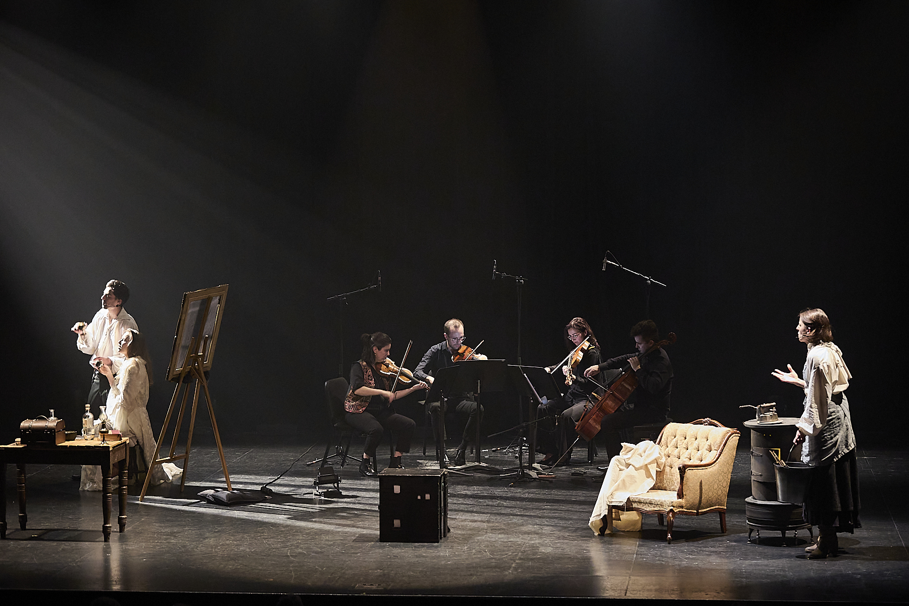 Sur le plateau quasi nu où l’on voit un chevalet côté jardin et une bergère près d’un poêle côté cour, évoluent les trois protagonistes. D’une grande élégance gestuelle en fille aux cheveux de lin, Gabrielle Maria Gourd incarne aussi une vieille propriétaire qui vient réclamer le loyer. Charles Roberge traduit avec éloquence les affres du créateur, de même que le désir de fuite dans les vapeurs de l’alcool. Amelia Keenan est une Rose d’une grande sensibilité et au grave d’une belle richesse. Si l’aigu s’avère parfois tendu et que la diction manque un peu de clarté, ce ne sont là que peccadilles en regard de la qualité de son chant. Quel dommage, cependant, d’avoir recours à la sonorisation, qui empêche d’apprécier pleinement le timbre de l’artiste et les subtilités du quatuor ! Car l’intelligence musicale de Stéphane Tétreault, conjuguée à la somptuosité de son violoncelle, est un pur délice. Il sait diriger avec beaucoup de précision et de raffinement les trois autres membres du quatuor, soit Marie Bégin (violon 1), Dominique Bégin (violon 2) et Elvira Misbakhova (alto), qui alternent avec bonheur d’un compositeur à l’autre. Grâce à leur jeu sensible et passionné, les quatre musiciens savent créer d’envoûtantes atmosphères qui font en partie oublier les faiblesses d’un livret qui pèche par le désir d’embrasser un trop grand nombre d’aspects biographiques, psychologiques et mythologiques.