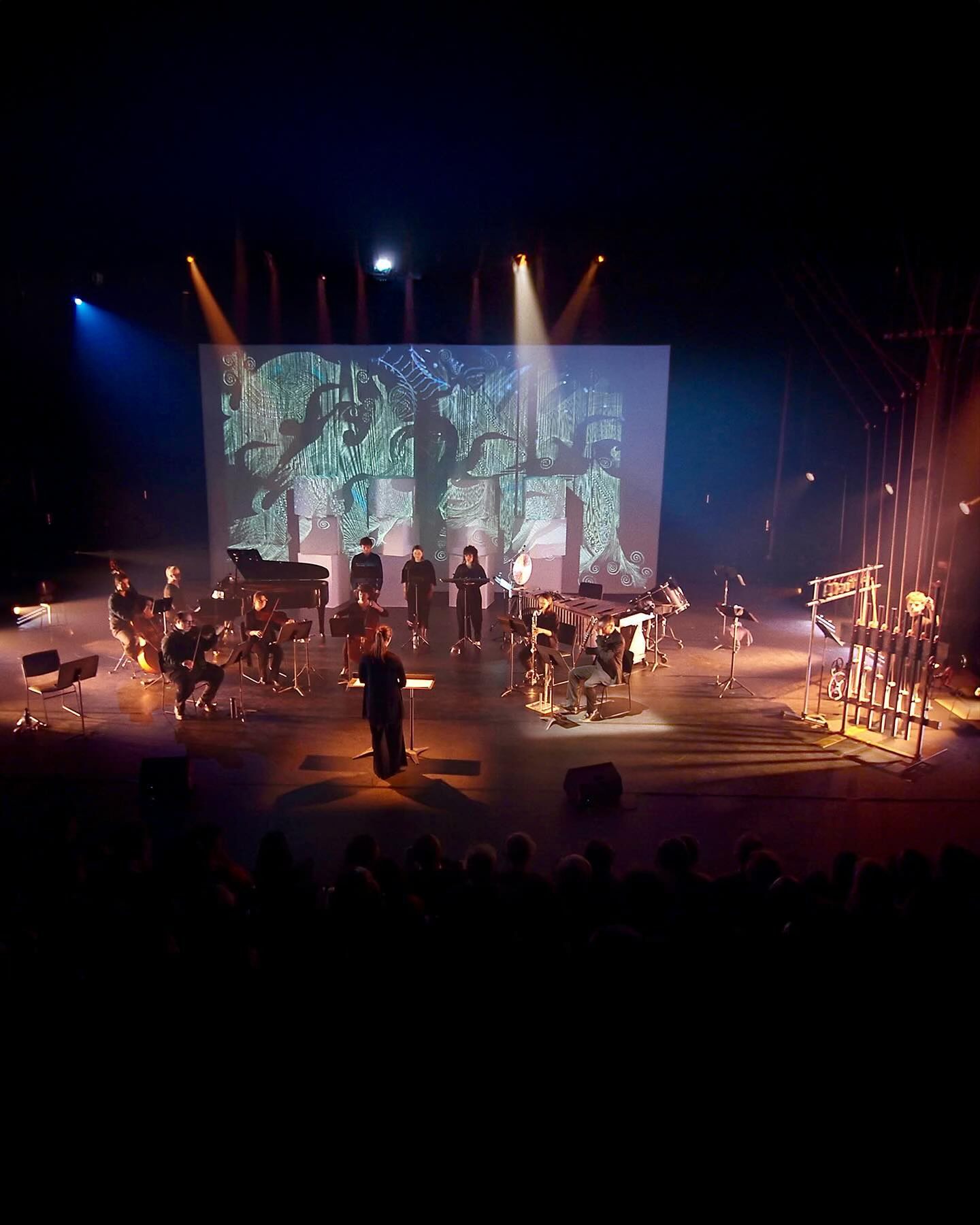 Le 15 octobre dernier, plusieurs organismes de création, production et diffusion en musique contemporaine se sont réunis pour donner à entendre la création de la toute nouvelle œuvre du compositeur et directeur artistique irano-canadien Roozbeh Tabandeh, Songs of the Drowning. Projet multidisciplinaire ambitieux, Songs of the Drowning se présente comme une mise en musique d’un cycle poétique du compositeur Sandeep Bhagwati, inspirée notamment par les œuvres de l’artistes visuel Khosro Berahmandi. L’équipe artistique réunie autour du projet est considérable, avec la collaboration de l’artiste visuel numérique Hadi Jamali, de la scénographe Haleh Vedadi et du concepteur d’éclairage Mateo Barrera. La partie instrumentale était assurée par l’Ensemble Paramirabo additionné de musiciens invités (Lyne Allard à l’alto et Pierre-Olivier Maranda à la contrebasse) et dirigé par la cheffe Mélanie Léonard.